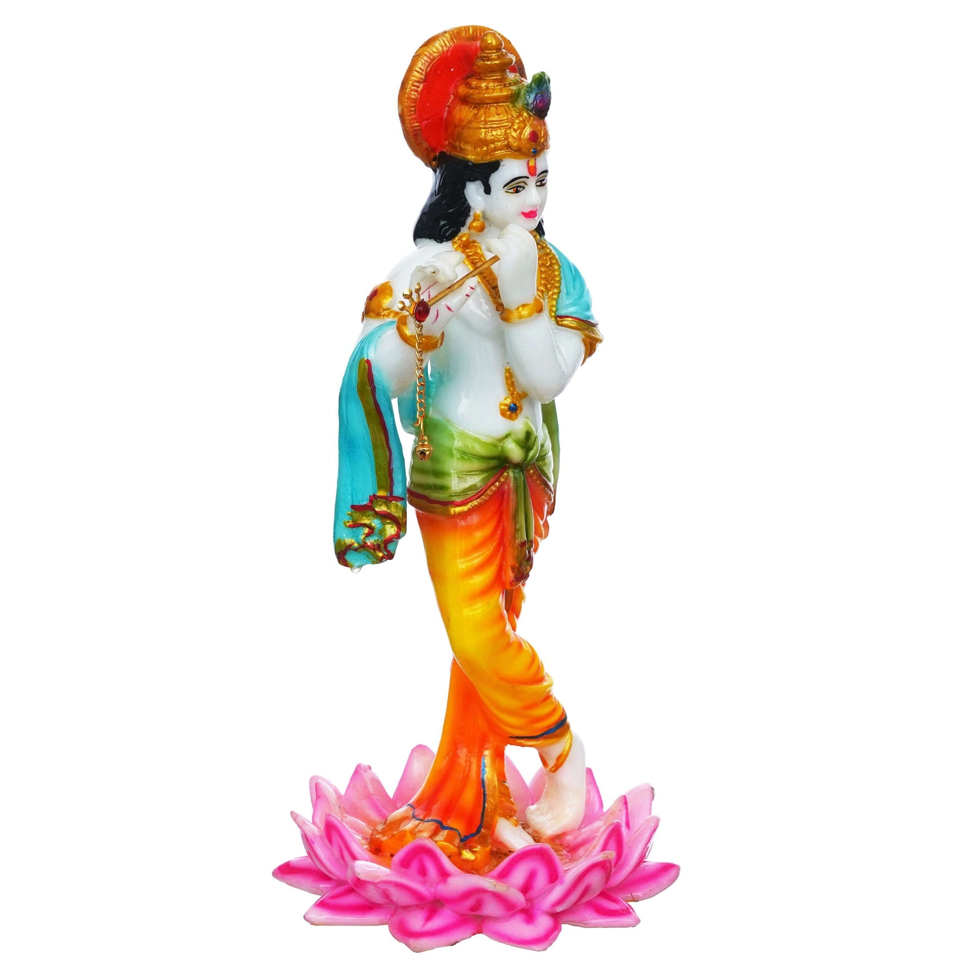 This beautiful statue depicts the Hindu deity Krishna playing his flute. Krishna is a central figure in Hinduism, and is often depicted playing the flute. The statue is made of high-quality resin and is hand-painted. It is 11.25 inches tall and would be a perfect addition to your home or office, or as a gift for a follower of Hinduism.